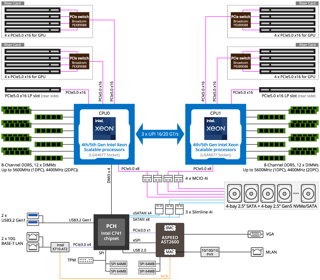 HPC/AI Server - 5th/4th Gen Intel® Xeon® Scalable - 2U DP 16 x PCIe Gen5 GPUs (with PCIe switches)