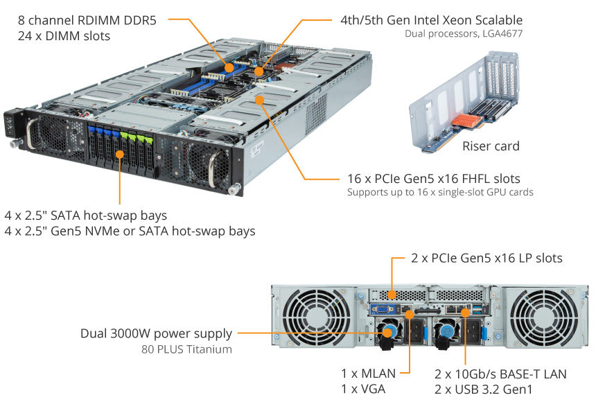 Engineering richer features in a revolutionary platform, Intel has made an incredible jump in processor performance in the business transformation journey. AI and deep learning performance will benefit from the built-in AI acceleration engines, while networking, storage, and analytics leverage other specialized accelerators in the 4th & 5th Gen Intel Xeon Scalable processors. Adding a host of new features to target a wide range of workloads, the new families of Intel Xeon processors will deliver even better CPU performance and performance per watt, and do so on a PCIe 5.0 platform with 2x the prior gen throughput to greatly speed up data movement to and from GPUs and storage. For this new platform, GIGABYTE has products ready to get the most out of Intel Xeon CPU-based systems that support fast PCIe Gen5 accelerators and Gen5 NVMe drives, in addition to support for high performant DDR5 memory.