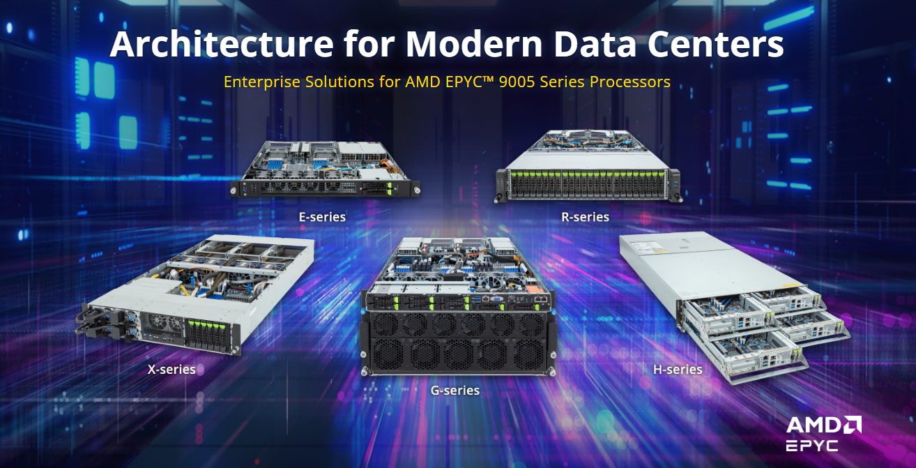 The SP5 socket has reached its pinnacle form with 5th Generation AMD EPYC™ processors. The same successful platform that was shared by AMD EPYC™ 9004 & 8004 series processors is now the same one for AMD EPYC™ 9005 series processors. With up to 192 cores, increased frequencies and cache, this top tier performance platform targets general purpose, cloud native, and technical computing. Building on the advantages of the EPYC™ 9004 series, the new EPYC™ 9005 series adopts the 3nm process with AMD “Zen5” and “Zen5c” core architecture, excelling in both energy efficiency and cost optimization. GIGABYTE has already prepared for this new processor with new servers and updates to existing products for 4th Gen AMD EPYC™ processors.