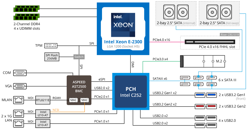 The Intel Xeon E-2300 processors offer 10 new processor varieties, including options with 4, 6, or 8 cores, and thermal design points (TDPs) ranging from 65W up to 95W. With Intel® Turbo Boost Technology frequencies as high as 5.1 GHz, and memory speeds up to 23 percent faster than the prior generation, these new processors outperform the prior Intel Xeon E processor by up to 17 percent. And when coupled with Intel® C250 Series Chipsets, this platform offers more I/O bandwidth and speed across options including new PCIe 4.0, more lanes of PCIe 3.0, USB 3.2 with new 2x2 (20 Gb), and SATA 3.0 support.